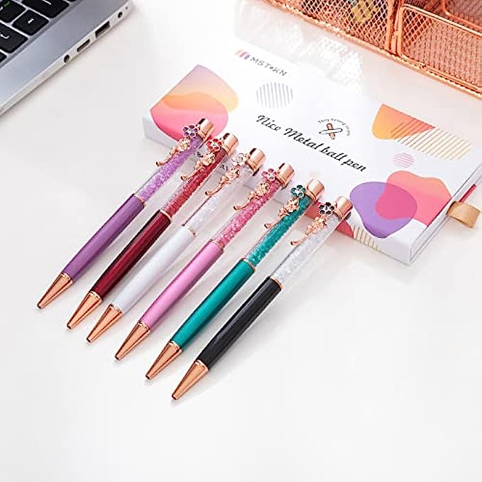 MSTOKIN Bling Crystal Diamond Floral Pen With Flower on The Pens Clip Black Ink Office Supplies Pack of 6 (6-pack clip flower pens)