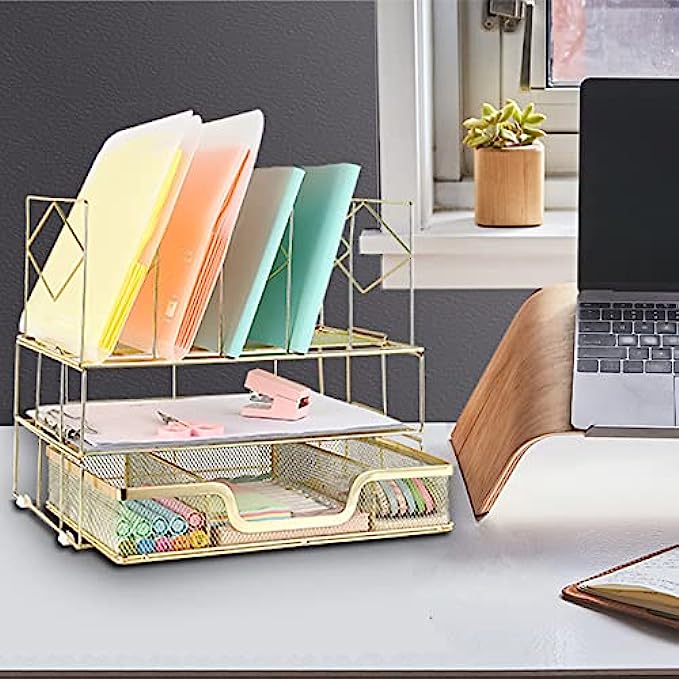 Youbetia Desk Organizers and Accessories - Double Tray and 5 Upright Sections, Office Supplies Desk Organizer with Drawer, File Office Organization with Binder Clips, Gold