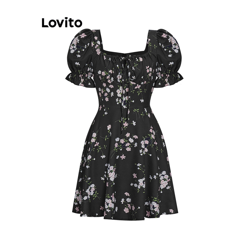 Lovito Casual Ditsy Floral Lace Up Dress for Women L68ED190 (Black)