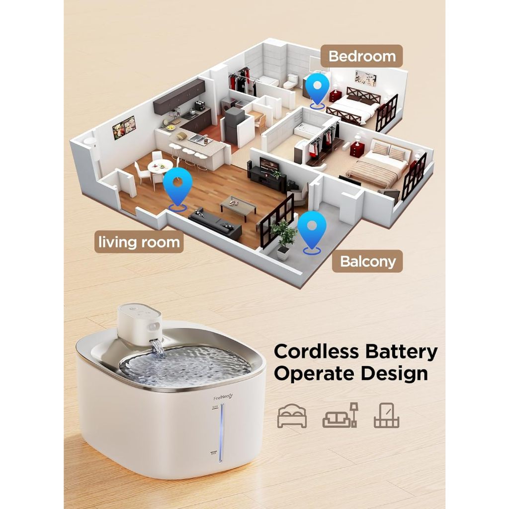 Appearance:sleek Suitability:wireless and sensor Quality:amazing My cat hasn't been drinking from the plate. This wireless fountain is so interactive that my cat, Biscuit, had its interest piqued and now he's drinking!